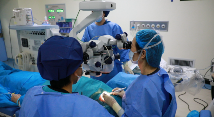 唐炘院长在为患者植入青光眼引流钉中