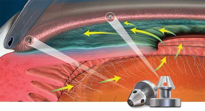 医生将其植入眼内前房角的小梁网区域,创建引流通道,增加房水内引流。它可以理解为,在眼睛原有的排水系统(小梁网)旁,架设了一条预设好的“微流通管道”,为房水外流提供一个更直接、更可控的新途径,从而稳定、持久地降低眼压。